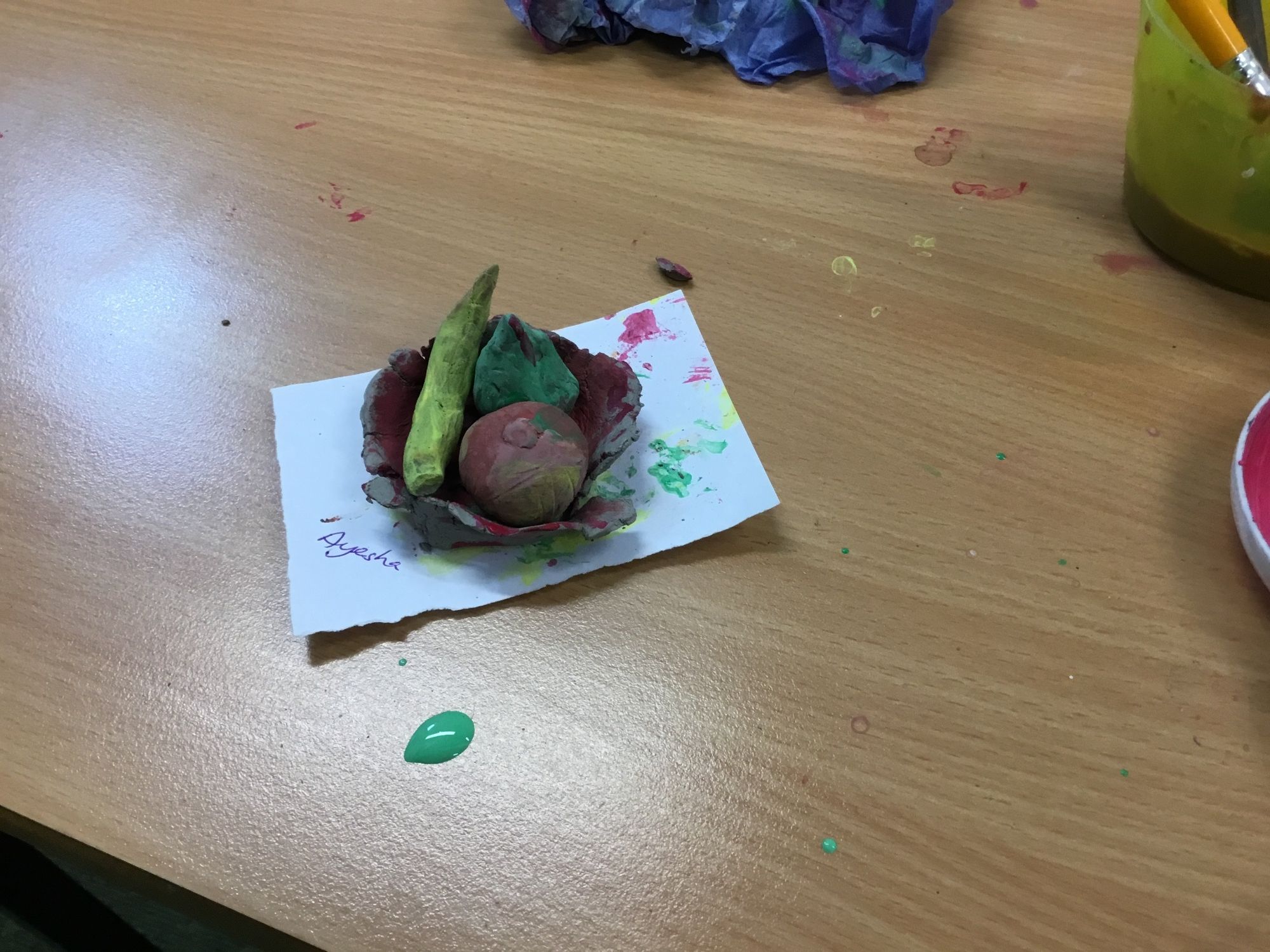 In art, the children finished their work inspired by the artist Paul Cezanne. They created clay fruit sculptures on Monday and later painted them.