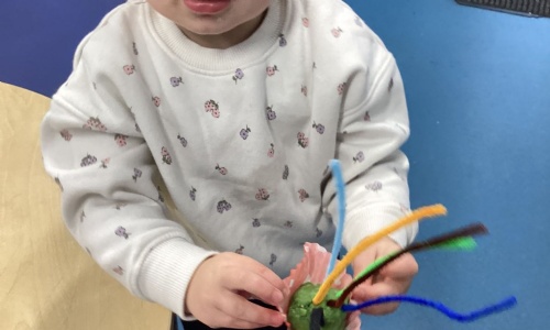 This week in Pre-School we have been busy in our creative area making play dough cupcakes. The children used pipe cleaners and glitter to make cakes for the teachers. The children also had a great idea of adding outside resources to their creations and placed leaves and twigs for decoration.