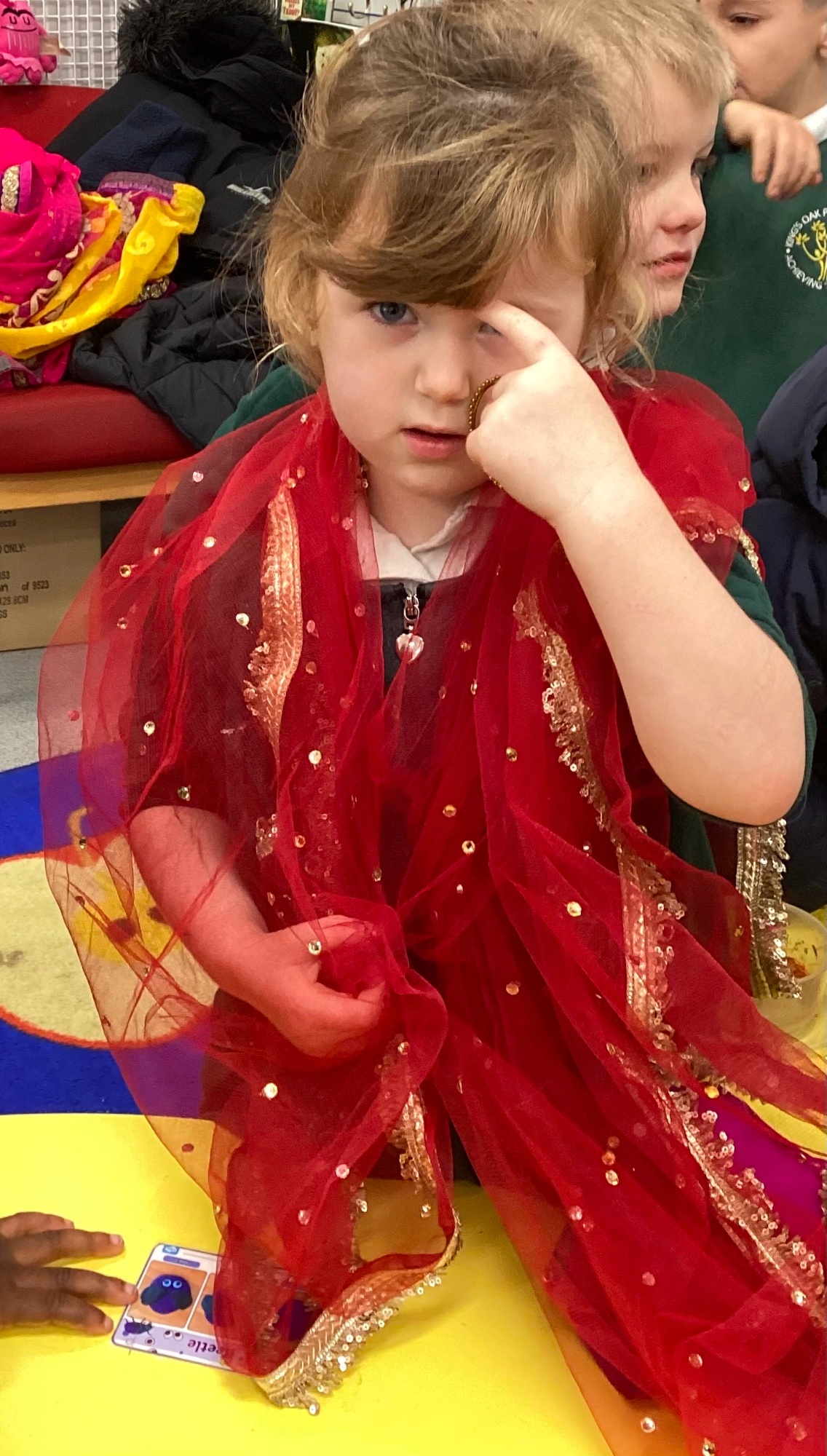 Our exploration continued as we looked at traditional Indian clothing, such as the beautiful sari and shiny bangles. The children had lots of fun dressing up in colourful outfits and even wearing bindis. They looked wonderful!