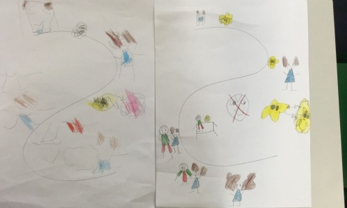The children are very familiar with the story now as they have heard it many times. So we wrote our own version of the story together in shared writing. We drew pictures of different parts of the story to remind us of what happened. This is called a story map. Then the children drew their own story maps as you can see above. The children then took turns to retell their version of the story using their maps.