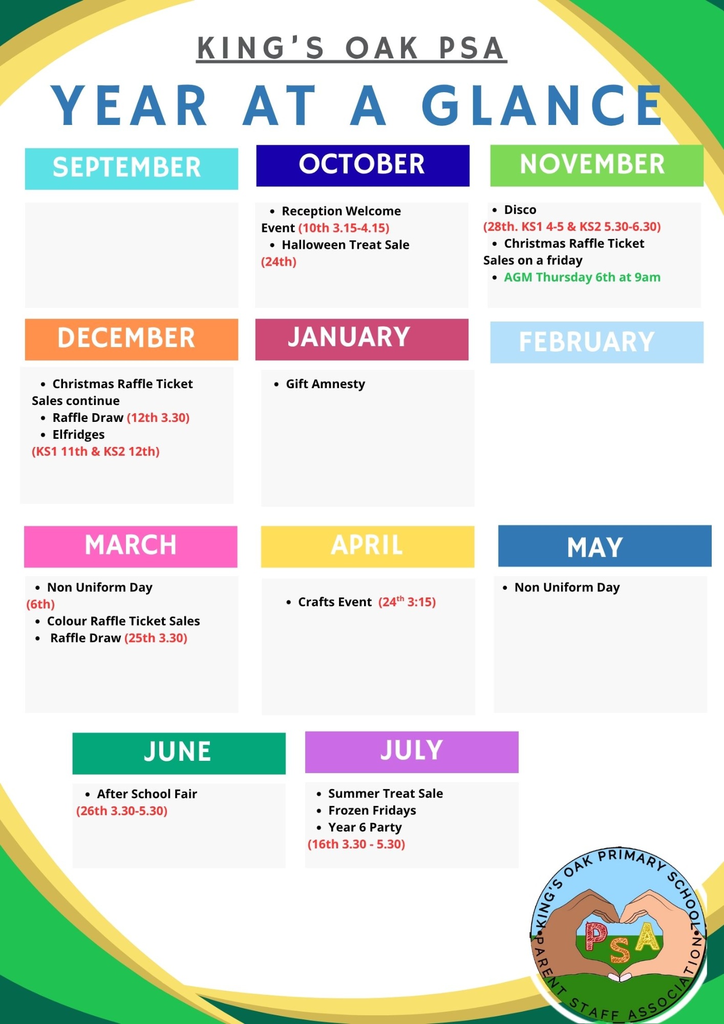 Our fabulous PSA team have put together an overview of the academic year so that you can see what events are planned over the year. It kicks off next Friday with the Reception Welcome Event - if you have a child in Reception, please book your space with your class teacher. There are lots of other great events to look forward to including treat sales, a disco, Elfridges, raffles and an after school Summer Fair. Please support these events and if you would like to help out, please contact the PSA. They are also holding their AGM on Thursday 6th November at 9:00 - please come along if you want to find out more about the PSA or want to get involved in supporting the committee - any additional support would be very much appreciated.