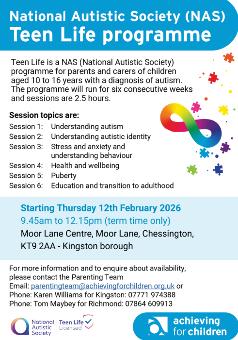 Please see the details below of a parenting course being offered by the National Autistic Society. It is taking place next year at the Moor Lane Centre in Chessington. To book a slot, please email - parentingteam@achievingforchildren.org.uk
